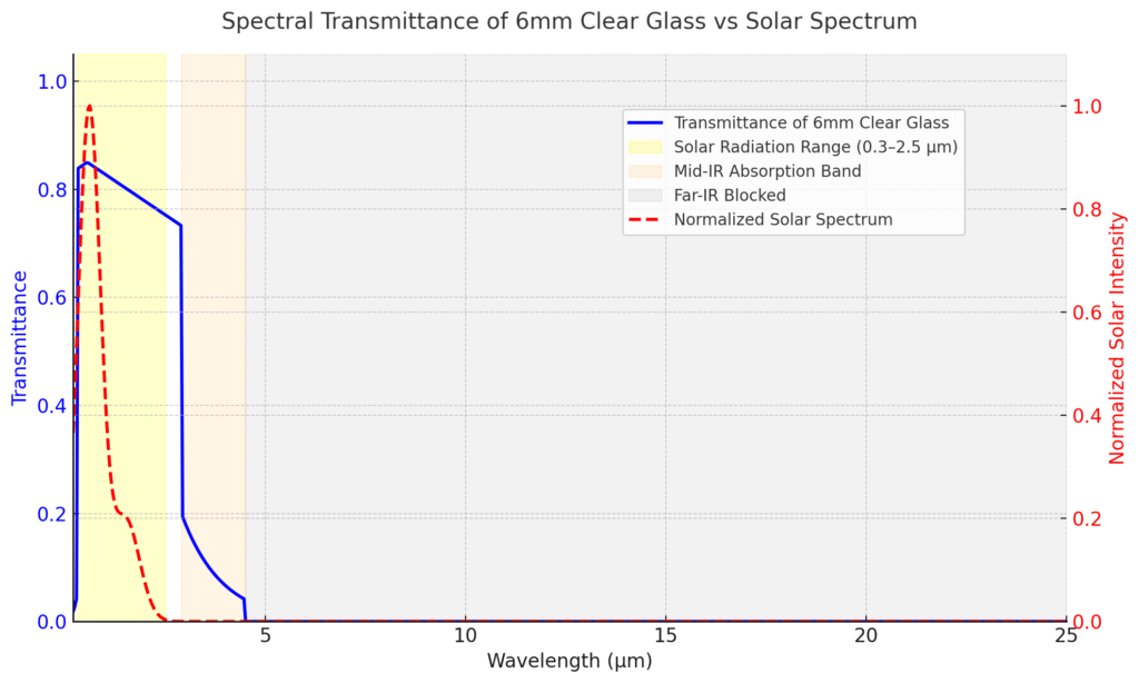 The figure above shows the spectral transmittance curve of standard 6 mm clear glass. In the wavelength range of 2.9–4.5 µm, the transmittance is very low, and beyond 4.5 µm it falls to zero. This means that long-wave infrared radiation cannot directly pass through ordinary clear glass.